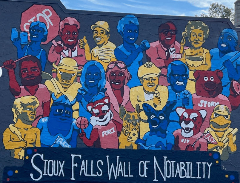 Another honorable mention is the "Sioux Falls Wall of Notability" a large mural that depicts the past, and present of the rich Sioux Falls history, and some of those who have helped shape our community. Artist Wyatt Dickson brought the mural to life in 2021.